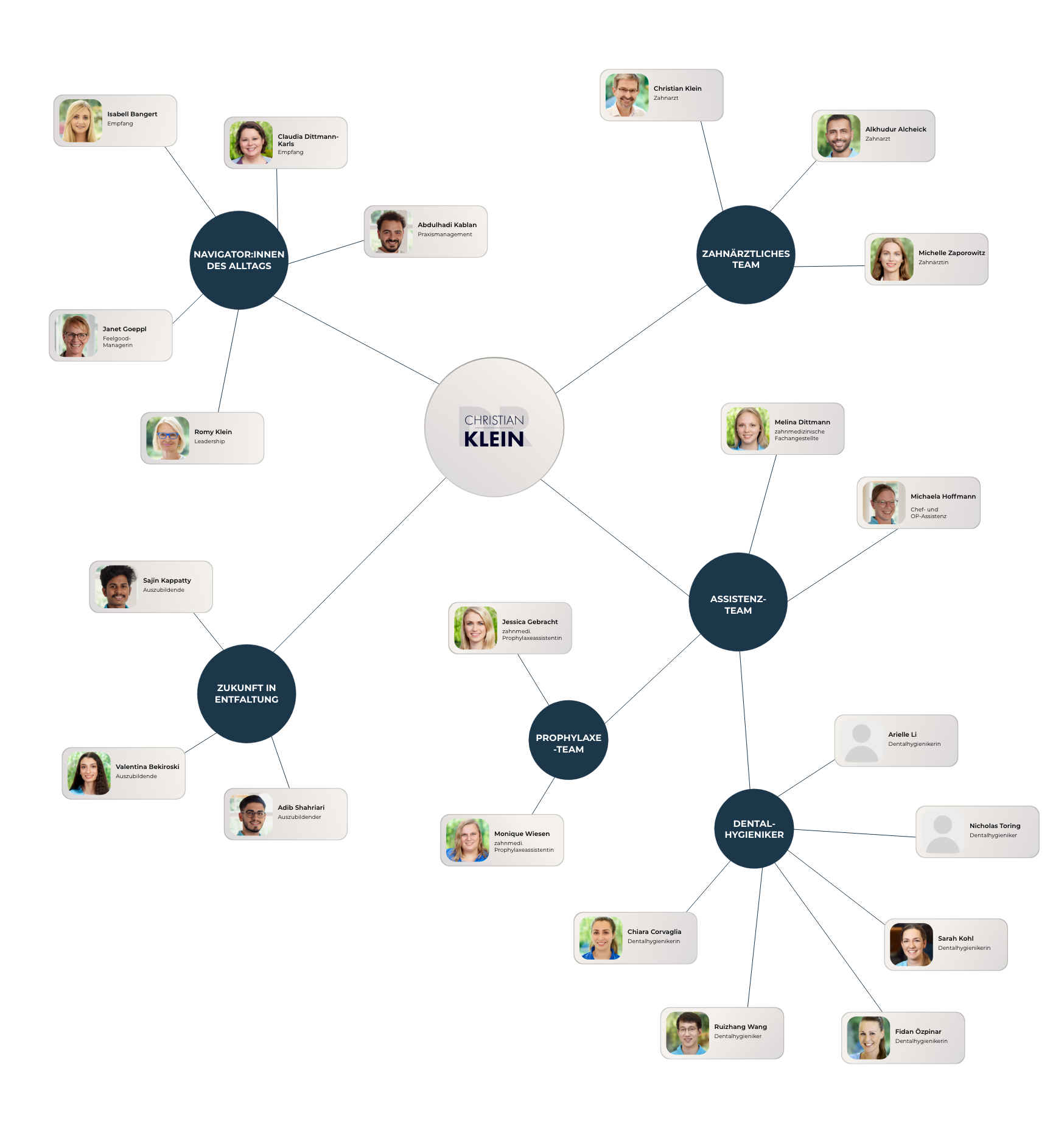 Bei uns arbeiten Menschen, die ihre Arbeit nicht einfach ausführen, sondern mit Sinn füllen: Unsere Zahnärzt:innen, Dentalhygieniker:innen, Prophylaxeassistent:innen, Assistent:innen und Kolleg:innen in der Administration tragen gemeinsam Verantwortung. Jede:r auf seine Weise – und alle mit dem gleichen Ziel: Ihre Gesundheit und Ihr Vertrauen.